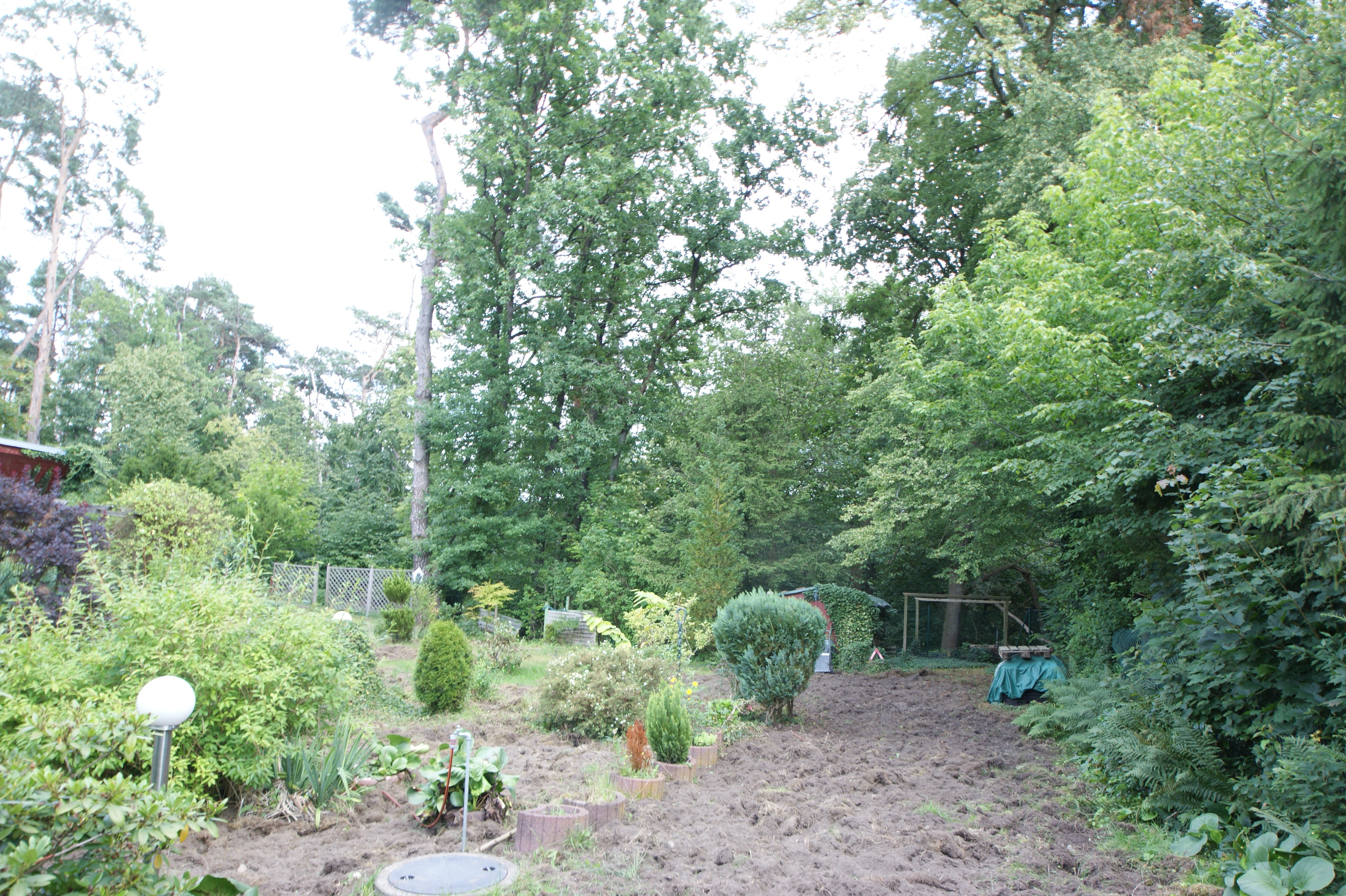Der Garten ist eben, ganz leicht abschüssig und nur wenig bepflanzt. So bieten sich einem Gartenfreund eine Vielzahl an individuellen Gestaltungsmöglichkeiten. Rosenbeete, Stauden oder andere Gehölze - Ihren diesbezüglichen Wünschen sind kaum Grenzen gesetzt. Natürlich ist auch genügend Raum für ein oder mehrere gemütliche Schattenplätze zum Entspannen vorhanden.